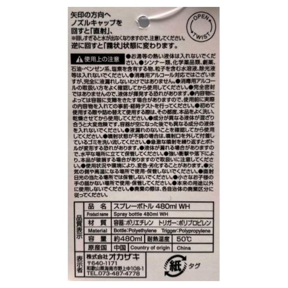 商品產地:中國 商品容量:480ml 商品材質:聚丙烯 / 聚乙烯 耐熱溫度:50度 商品說明:酒精用噴瓶 ♪ 容量480ml,對應酒精濃度為75%以下 細緻噴霧頭設計,噴頭可自行替換使用~ ※ 注意!商品不可接觸火源