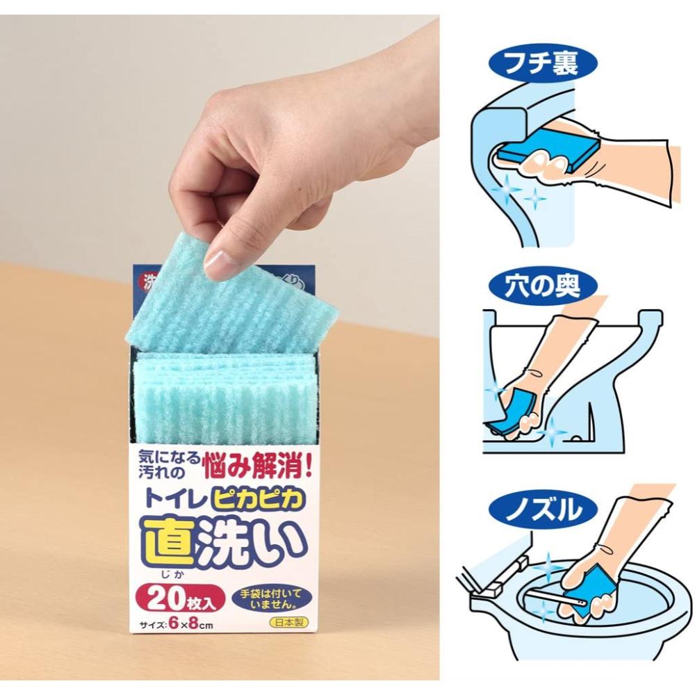 商品產地:日本 商品尺寸:80×60×3mm 商品材質:聚酯纖維 商品說明:20枚入清潔綿片 一次性使用!1枚尺寸約6×8CM 聚酯纖維加撚製成的特殊綿片 無需使用清潔劑即可去除頑固污漬 徹底清潔刷子不易清洗的地方 馬桶的邊緣/背面/噴水孔皆可適用~ 戴上手套後,可直接用手清洗馬桶上污垢 ♪ ※ 注意!一次性使用,使用完不可用水沖洗