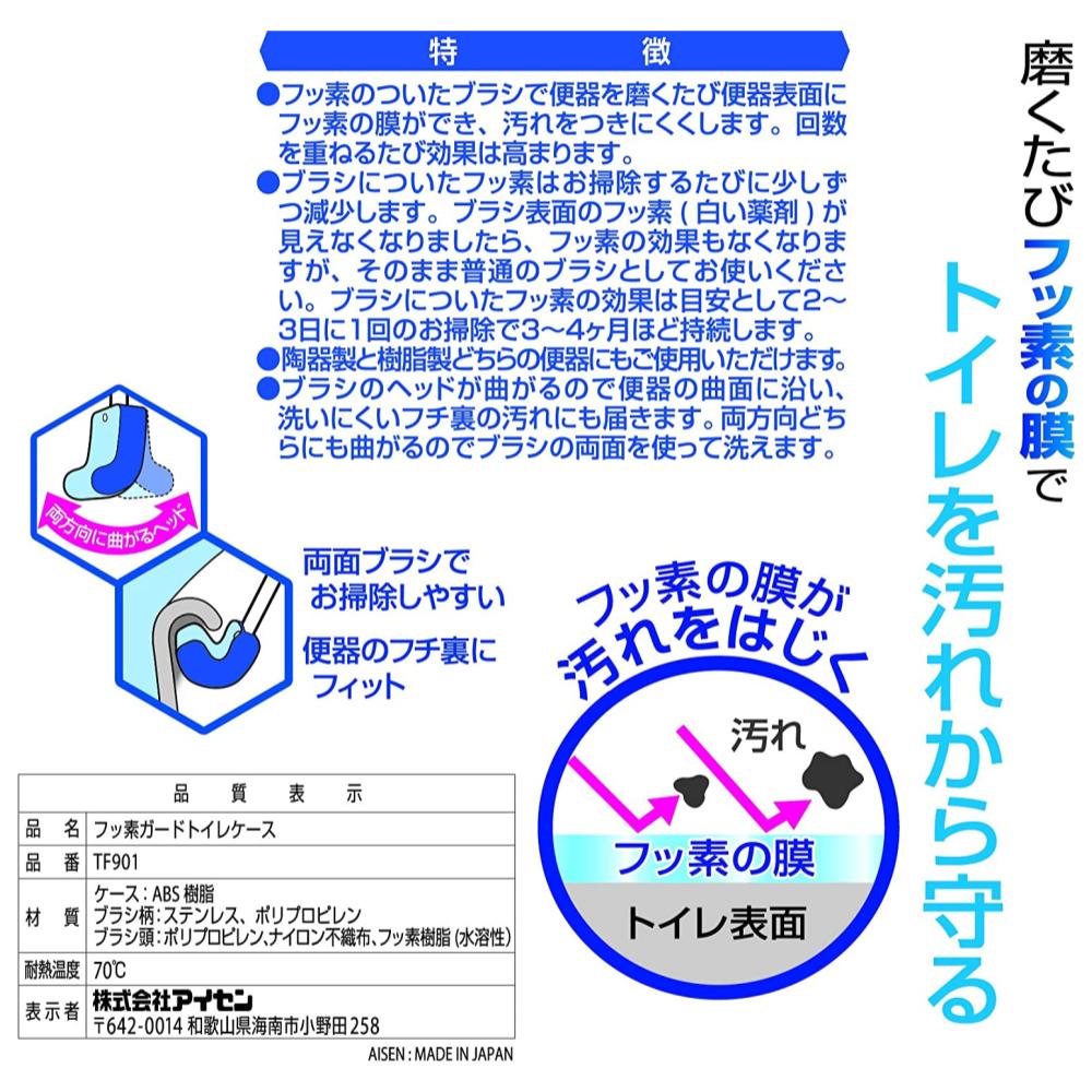 商品產地:日本 商品尺寸:75×92×380mm 商品材質:收納盒-ABS樹脂 刷子-不鏽鋼 / 聚丙烯 尼龍無紡布 / 氟樹脂(水溶性) 商品說明:馬桶刷附吸盤收納盒 ♪ 採用含氟馬桶刷,表層氟膜不易弄髒 附吸盤收納盒,刷子可掛於箱子上晾乾 刷頭雙向彎曲,刷子兩側皆可進行清洗 刷頭可順著馬桶的曲面清洗邊緣深處的污垢~ ※ 氟的效果可持續 3-4個月 ※ 每2-3天清潔1次即可~