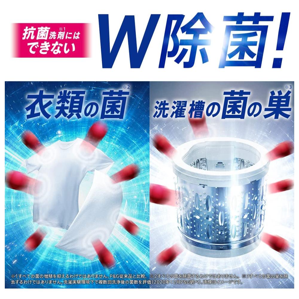 W殺菌保持去污力,並對衣服/洗滌桶進行除菌