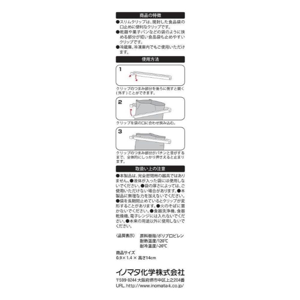 商品產地:日本 商品尺寸:9x14x140mm 商品材質:聚丙烯 耐熱溫度:-20 - 120度(可冷凍) 商品說明:4入組合 ♡ 適用袋子寬度最大約11CM 細長型設計,長寬型封口夾 各種袋口及大餅乾袋皆可適用 可有效防潮保鮮,確保食物新鮮度 使用於薄袋子時,可捲兩圈再夾上 ♪ 餅乾開封後,完全不用擔心吃不完~
