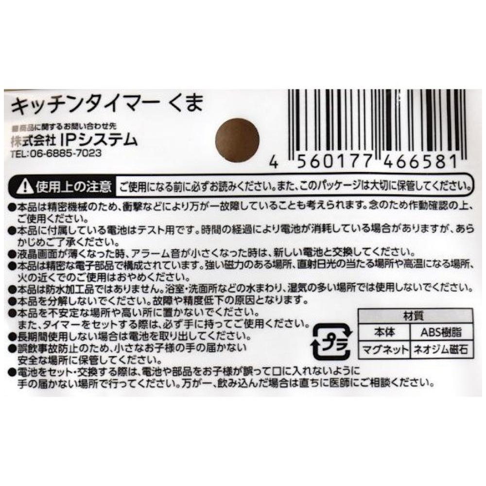 商品產地:中國 商品尺寸:50x55x20mm 商品材質:本體 - ABS樹脂 磁鐵 - 釹磁鐵 商品說明:廚房計時器 ・隨機附帶一顆水銀電池 ・小熊造型,共兩種顏色 ・設定最大值為99分59秒 ・分秒同時按,即可歸零 ♪ ・從00:00的狀態按下開始按鈕 ・即可計數及測量時間,多用途 ♡ ・磁吸式設計,可吸附於鐵櫃或冰箱上使用